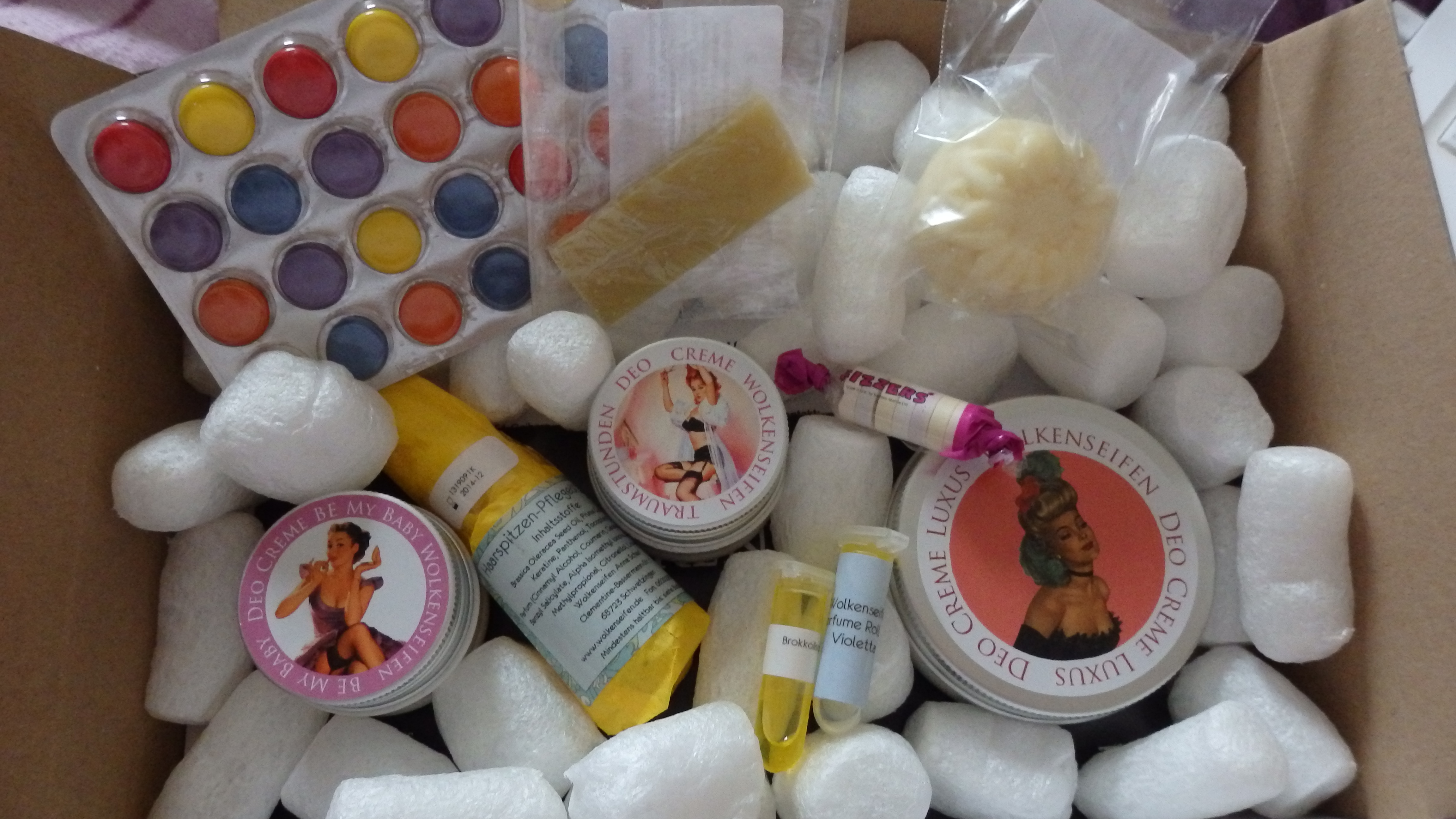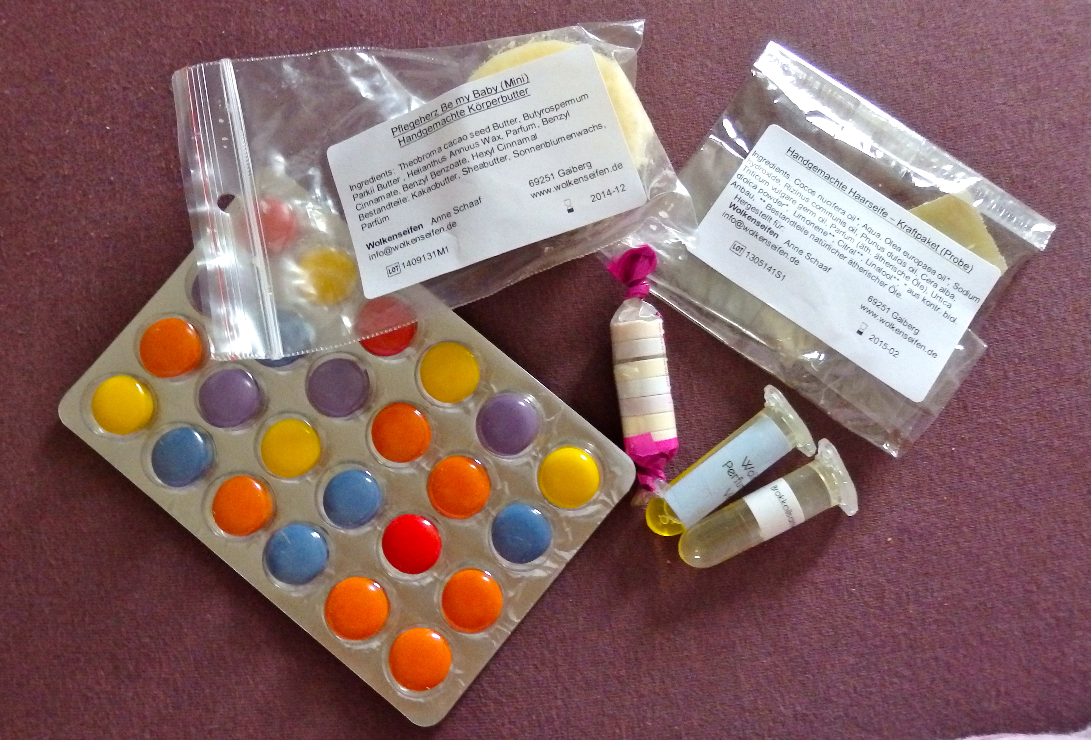 Besonders gefreut hat mich diesmal die Probenauswahl. Auf so eine Haarseife war ich schon mal neugierig. Das wird demnächst auch getestet wie sich sowas gegen konventionelles Shampoo schlägt. Und dann diese mini, handgemachte Körperbutter passend zum Deo, ich bin entzückt. Körperbutter kannte ich bisher nur von Lush, deren Duft ich aber mittlerweile nicht mehr ertrage. Von daher freue ich mich speziell über diesen Nachfolger, der gleich heute zum Einsatz kommen wird. Die Süßigkeiten gehen an Mr. Carrieforshoes…der liebt Smarties und bunte Brausesachen.