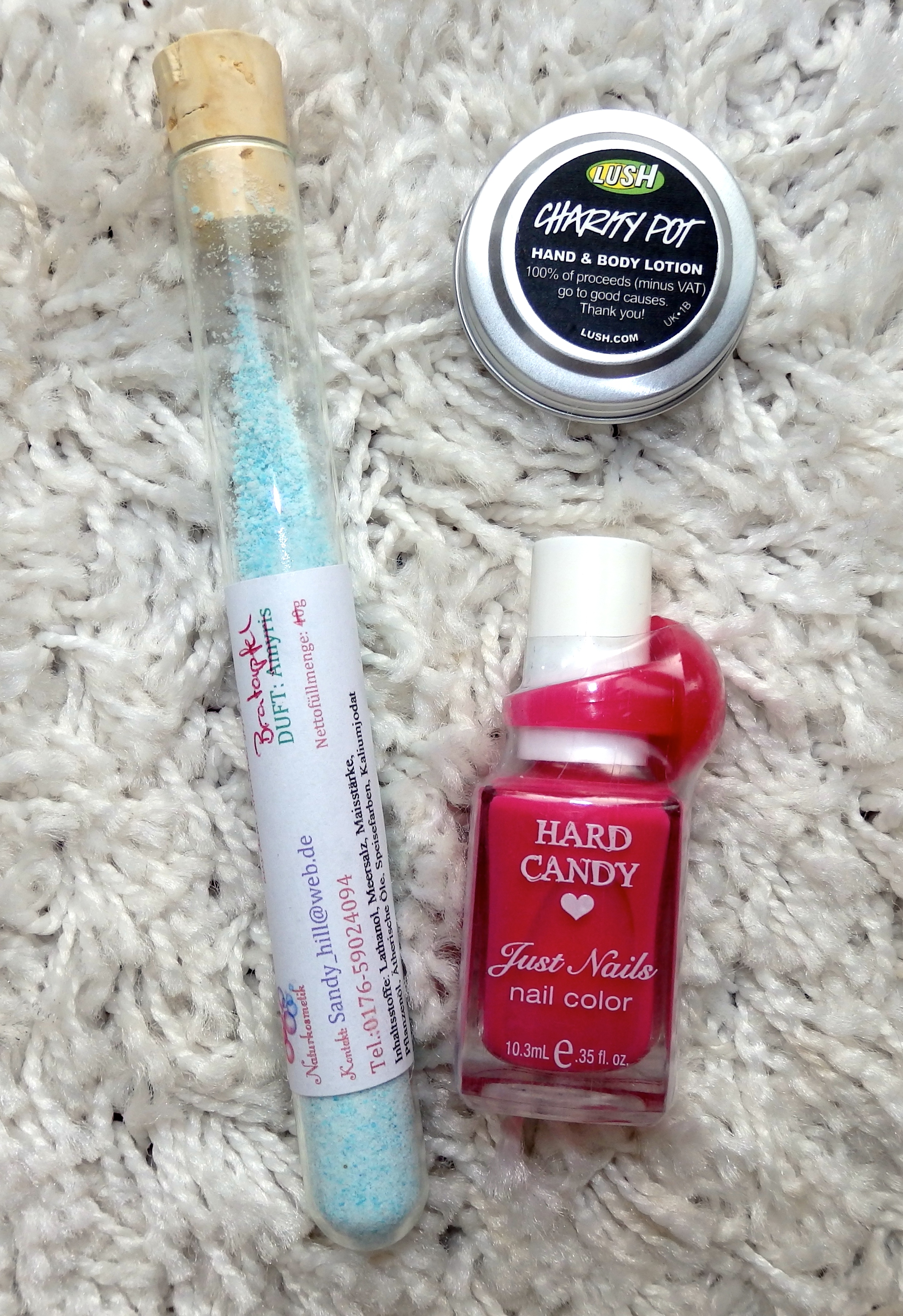 Die Mandelölsalbe ist mir zu fettig für das Gesicht, aber super geeignet für Ellenbogen und Knie, schwer vernachlässigte Zonen im Winter. Badesalz ist schon verbraucht, weihnachtlicher Duft, Badesalz halt, aber solide. Das Peeling mische ich immer mit meinem Vitamin C Pulver, das macht glatte Haut. Solides Peeling, nice to have. Der Nagellack wandert in die Geschenkebox, die Lush Minidose in die Handtasche. Insgesamt ganz ok, aber nichts, was mich jetzt vom Hocker reißen oder in Freudentänze fallen lassen würde.