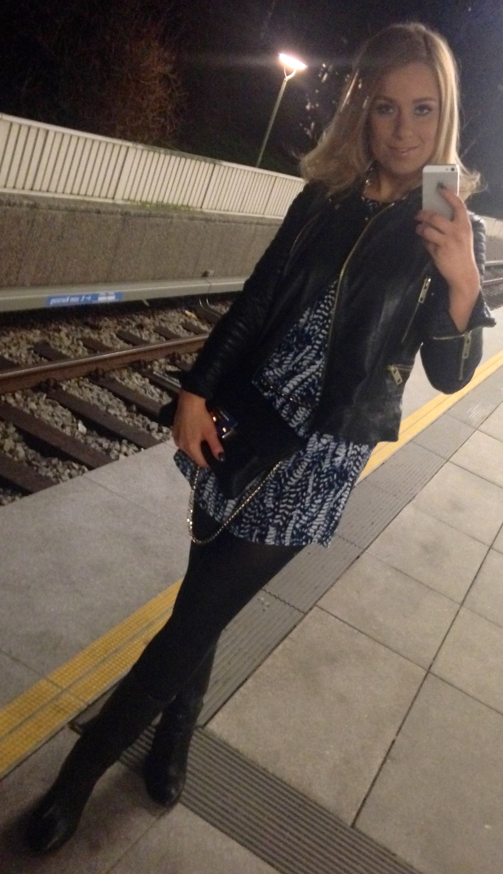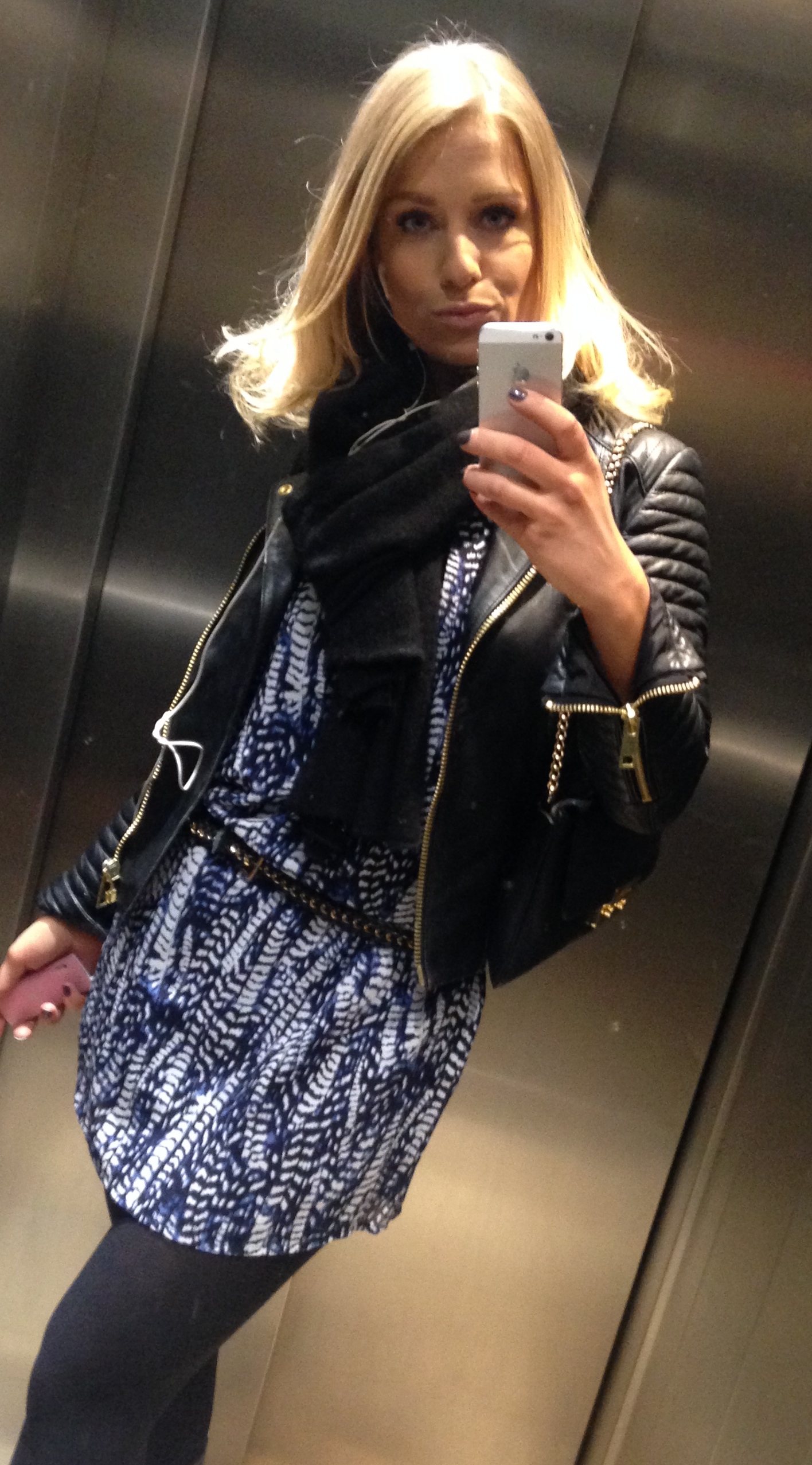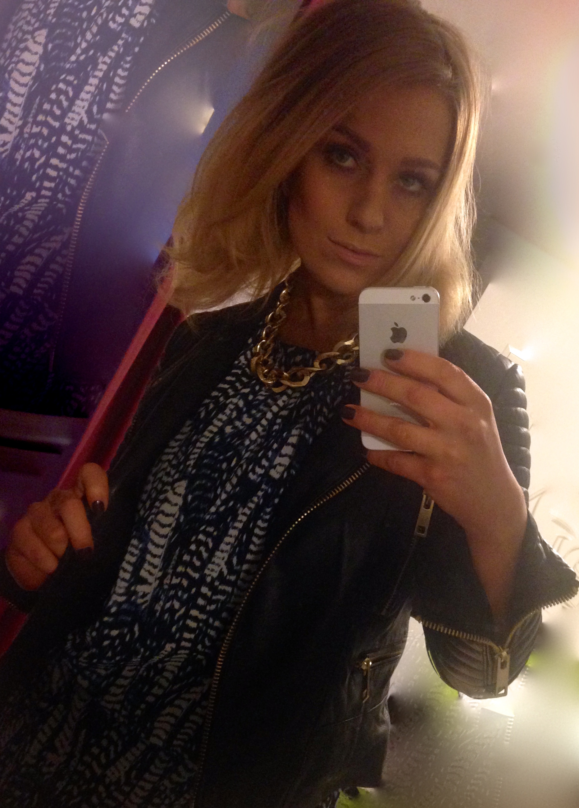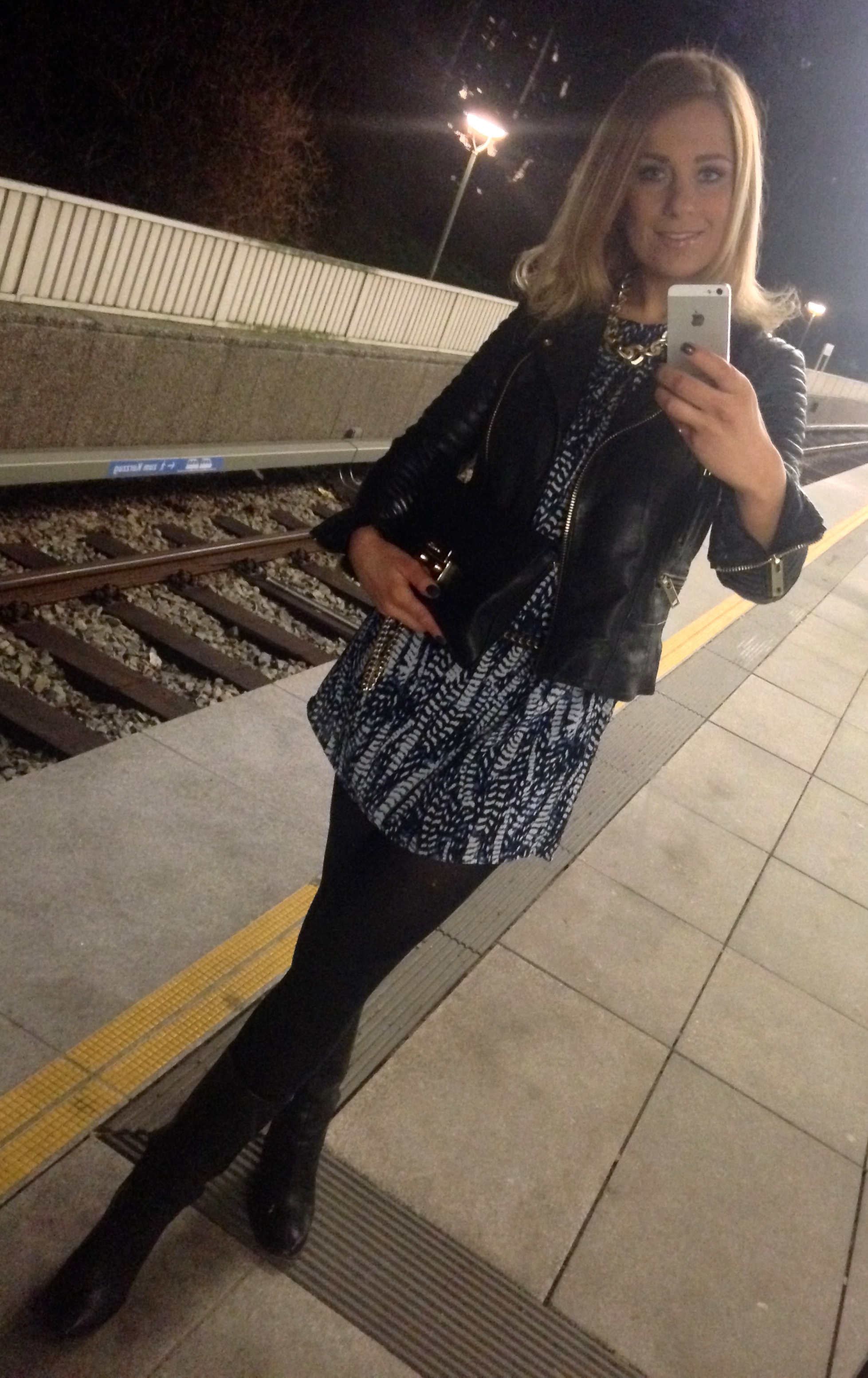 gemustertes Kleid und goldene Gliederkette von H&M The new icons Kollektion, Bikerlederjacke von Mango (letztes Saison), scharz- goldener Gürtel von Zara (2010), schwarze Clutch von Michael Kors und schwarze Lederstiefeletten von Zara (2012)