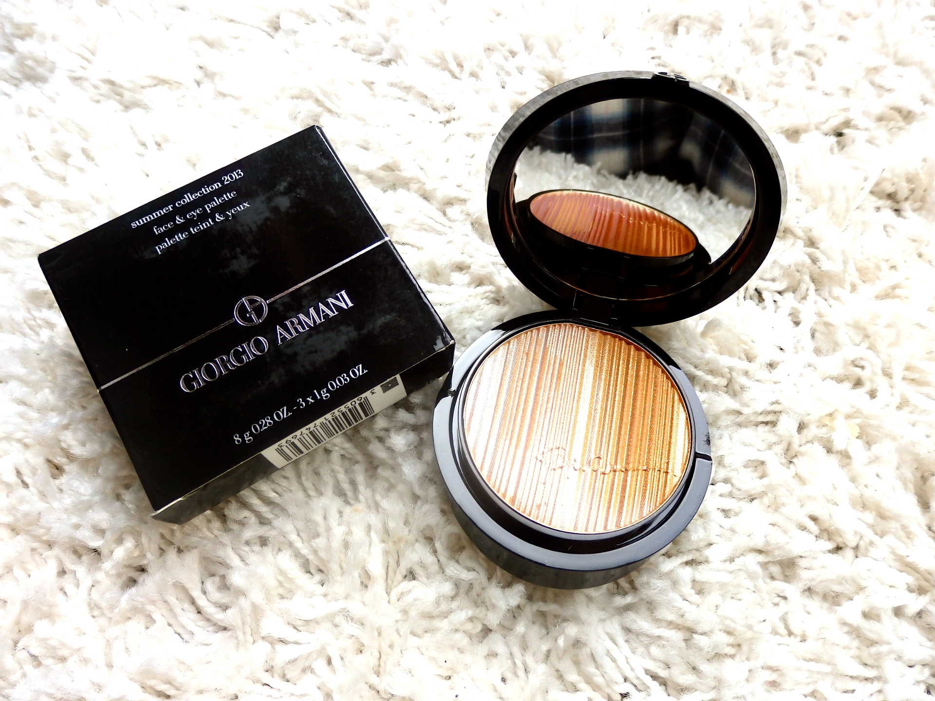 der Reiz des Neuen und Unbekanntem dürfte geläufig sein und ein besonders gehäuftes Auftreten in meinem aktuellem Bewusstsein. Man könnte diesen Reiz aber auch als Perpektivenwechsel zur Ansicht sehen, das Neues und Unbekanntes, bisweilen auch Ungewisses, die menschliche Urangst in sich birgt, da man schlicht und ergreifend nicht weiß, was da auf einem zukommt und sich wirklich hinter den Dingen oder auch Personen verbirgt. Diesen Reiz als Herausforderung für ein wenig mehr Aufregung im Leben zu betrachten anstatt verunsichert in eine Zukunft zu blicken, scheint daher fast ein zwingend notweniger Schritt zum persönlichen Wohlbefinden und Glück. So aufregend undreizend war übrigens auch die Art und Weise, wie ich die Inspirationsquelle des FOTD geraten bin. Herzstück des heutigen Look ist nämlich die Eye & Face Palette aus der Summercollection 2013 von Giorgio Armani. Unter Bloggern wohl ein alter Hut, da bereits vor fast einem Jahr gelauncht, verschickt oder reviewed. An mir jedoch irgendwie vorbeigezogen (bei Preisen von 75-80€ pro so chicem Teil auch nicht soooo verwunderlich), doch rechtzeitig neu, OVP und zu einem moderatem Preis auf Kleiderkreisel wieder in mein Augenlicht getreten…und dann kurz nach der Ankunft beim Öffnen, der Moment „Curious plus X“, wobei das X hier den Platz absoluten Freude über den gelungenen Blindkauf symbolisiert, welche auch gleich im FOTD und AMZ festgehalten werden musste in meinem bewährtem Signature Look.