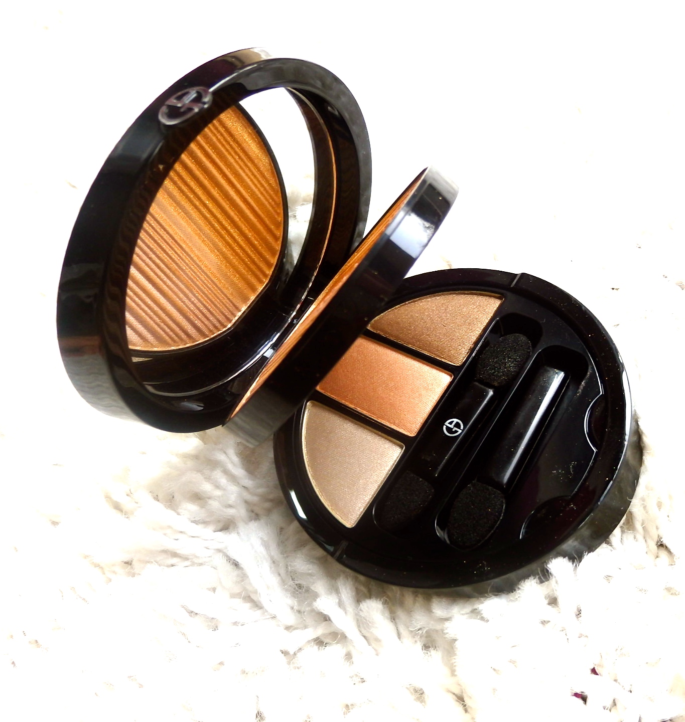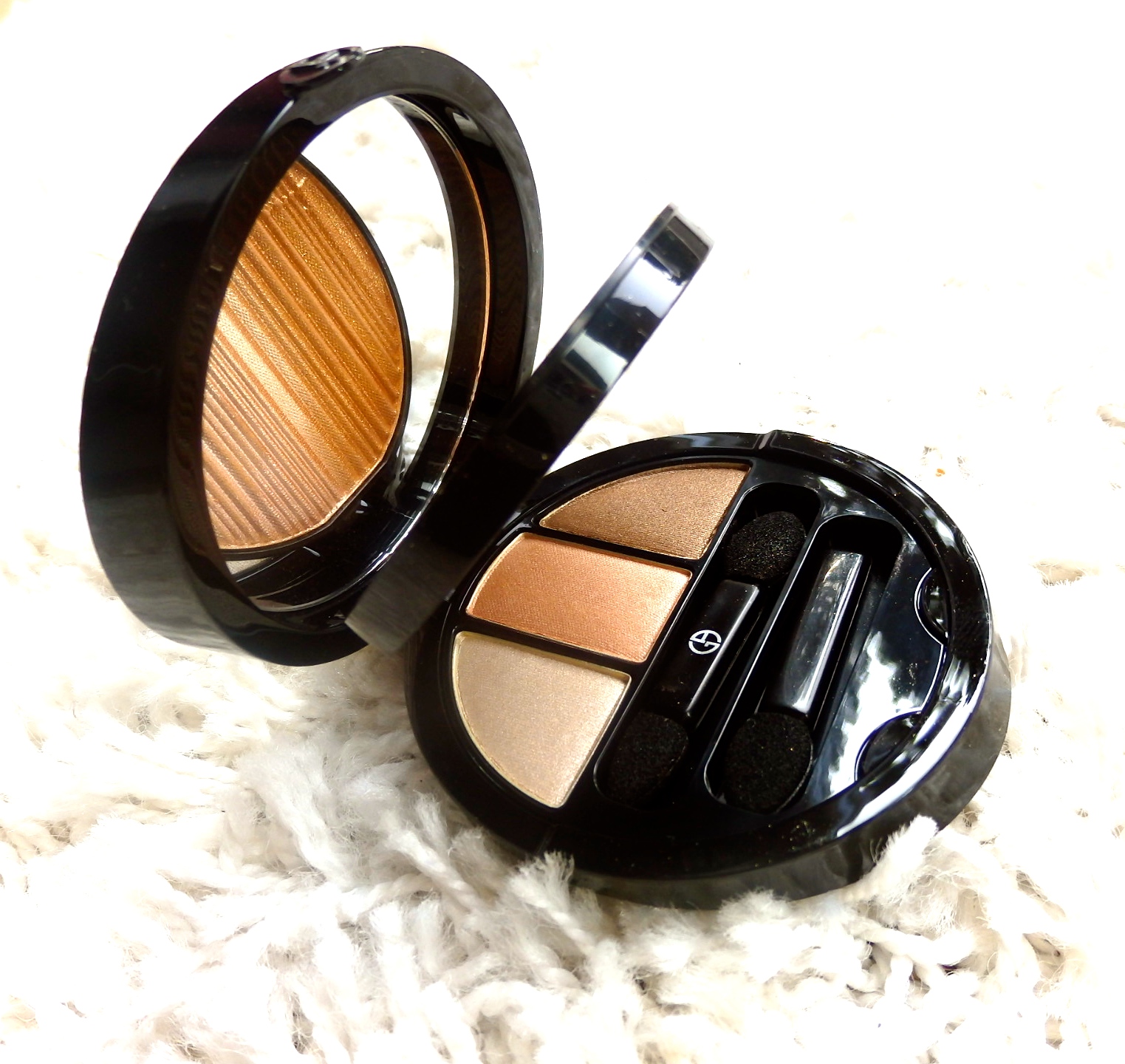 Da diese LE schon seit geraumer Zeit nicht mehr verfügbar ist und ich mich auch keiner Swatches bei den üblichen Verdächtigen mehr entsinnen kann, war das ganze Unterfangen schon gefährlich, denn Fotos können trügen. Allerdings konnte ich in einer Mischung aus Neugier plus X (=Variable, in diesem Fall das Schnäppchengen und Habenwollenmüssensonststerbeich) dem Reiz des Unbekanntem nicht widerstehen und die Palette wurde geordert und kam ein paar Tage später just in time morgens zum Schminken an. Der goldene Highlighter fällt tatsächlich etwas dunkler aus und wirkt daher auf gebräunter Haut entsprechend highlightender als bei vollkommen blasse Teint. Jedoch das Konzept der Sommerpalette in die Wertung mit einbezogen, macht das auch Sinn. Allerdings verbirgt sich darin auch ein heller Bronzer, der Hellhäutchen entsprechend in der Summerglow versetzen kann. Die Lidschatten, braun, zartes peachiges Rosé und beige-weißer Highlighter sind solide aufeinander abgestimmt. A Traum halt. Die schwarz-glänzende Armani Dose macht sich übrigens auch sehr handlich unterwegs, da sie mit ca. 3cm Höhe noch einigermaßen schmal genug für mein Schminktäschchen ist und man eben alles aus dem frisch geschminktem Farbtopf für Touch Ups unterwegs dabei hat. Der Inhalt wäre mit 8g goldenem Highlighter oben und 3x 1g Lidschatten im unterem Abteil noch erwähnenswert. Das sind schon einmal Werte bei denen das von Bloggern und anderen Schminksüchtigen ersehnte bzw. gefürchtete „Hit the pan“ Gefühl sich nicht so schnell bei regelmäßigem Gebrauch einstellen sollten. Zwei Pinselapplikatoren sind auch dabei, allerdings entlocken sich mir aufgrund einer beachtlichen Pinselausstattung nur ein müdes Lächeln ab. Ich frage mich, warum Luxusmarken uns pinselfreudige Geschöpfe immer wieder und noch mit diesen Dingern abspeisen wollten. Dann hätte Armani in diesem Fall doch in logischer Konsequenz doch auch an etwas zum Auftragen des Highlighters denken müssen. Es bleibt mir daher weiterhin schleierhaft, dass da nicht mehr Produkt für die stolzen 75-80€, die so ein Teil kostet, geliefert wird, dafür aber diese Märchenapplikatoren, über die ich mich hier und hier bereits ausführlich ausgelassen habe. Das war nun das Wort zum Sonntag…habt eine superschöne neue Woche und viel Spass beim Pinseln, Cremen und Leben…