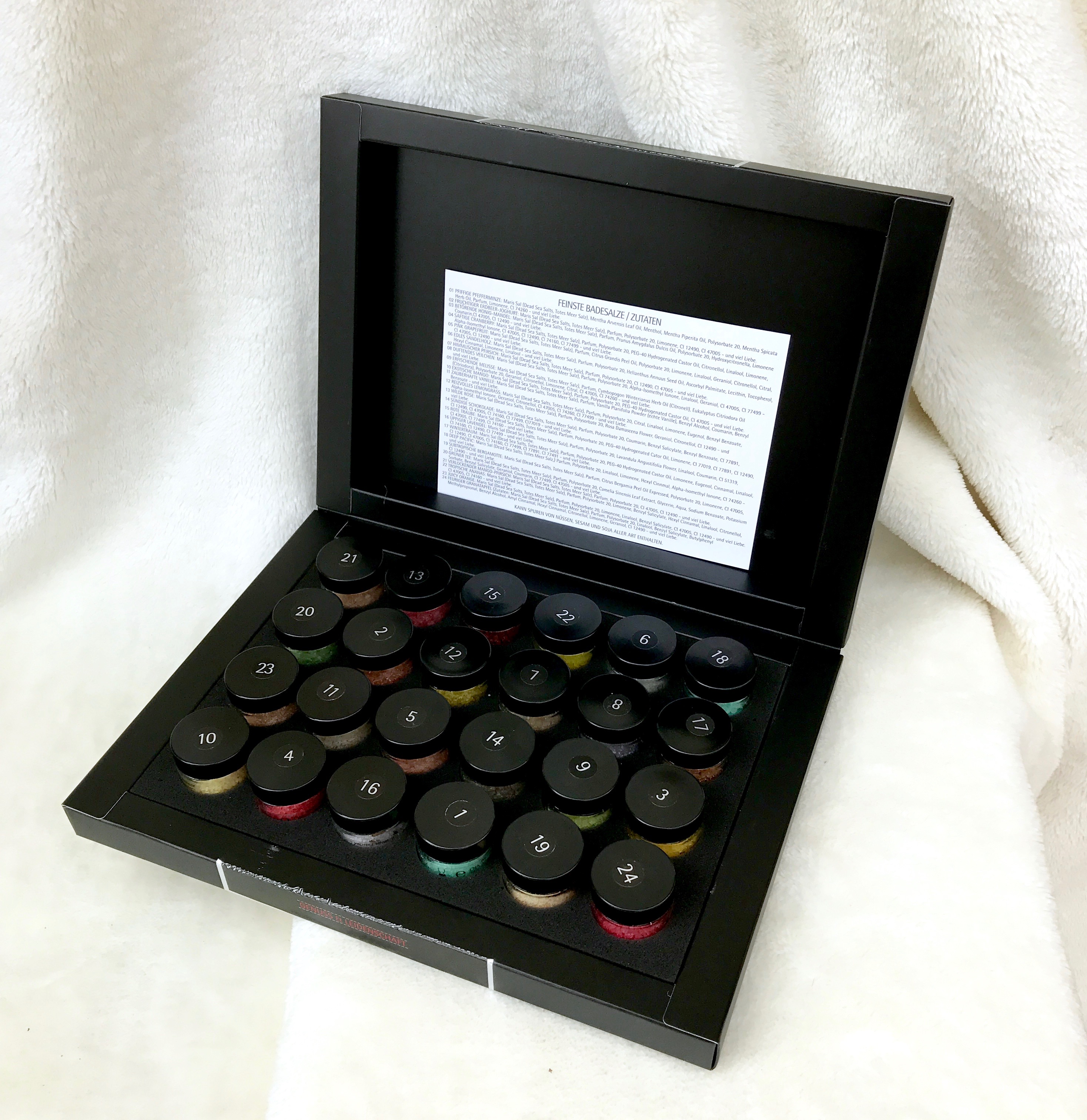 Die Badesalze kommen in wiederverschließbaren Minigläsern einher und sind herrlich bunt und duften nach allen Facetten. Geschnuppert und gebadet werden darf dann ab 01.12 in den Badesalzen mit Totem Meer Salz, athäerischen Ölen und Aromen…Verpackt ist das Ganze übrigens auch sehr edel, in einem schwarzen Geschankkarton. Die kleinen Gläschen kann man danach bestimmt auch gut weiterverwenden. Ich denke da an lose Ohrringe und Schmuck, den man darin sicher und sichtbar verstauen könnte…jetzt freu ich mich gleich noch mehr. Die Jungfrauen unter Euch können das bestimmt verstehen, wenn edle Verpackung auf Pragmatismus trifft, kommt ein Jungfrauenherz nicht umhin zu hüpfen…welche Ideen habt ihr denn für das Weiterleben von edlem Verpackungsmaterial?