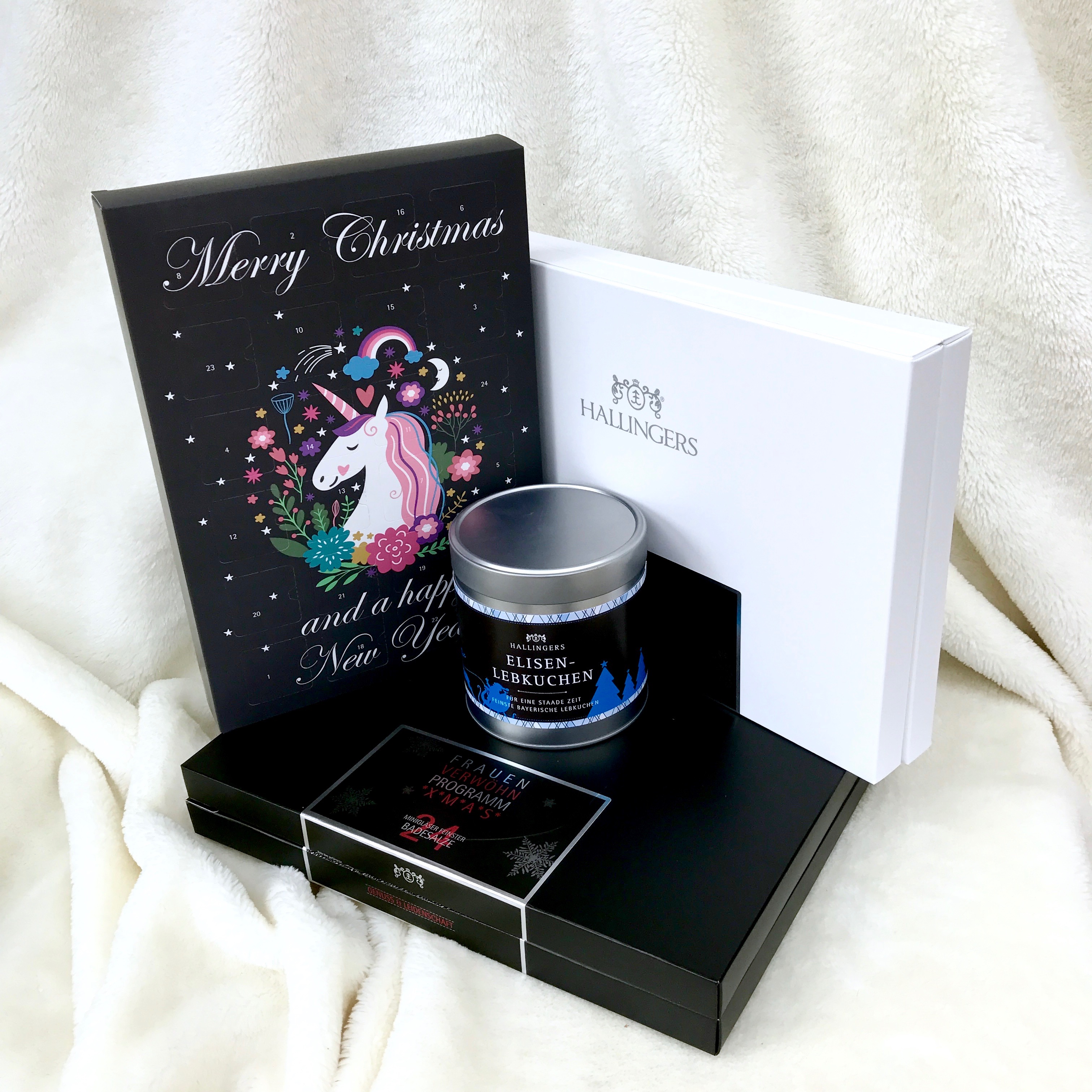 Die Elisenlebkuchen haben sich also todesmutig vor den Kalender geworfen, damit dieser in der Adventszeit morgendliche Genüße auf die Zunger zaubern darf. Und der Einhornkalender ist wirklich zauberhaft! Er ist ganz samtig beschichtet und fühlt sich schon mal gut an, dank des soften Materials. Und das Einhorn ist so süß, aber was sage ich da im Jahre 2017 des allgegenwärtigen Einhorns. Hallingers Pralinen und Kalender sind übrigens made in Bavaria, by the way.